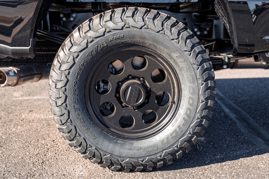 This F-350 features color-matched bumpers that give it a clean, refined look. It sits on 18-inch Pro Comp wheels paired with BFGoodrich Mud-Terrain T/A KM3 tires, providing an aggressive stance and excellent off-road performance. Built to handle tough conditions while still looking sharp on the road.